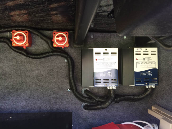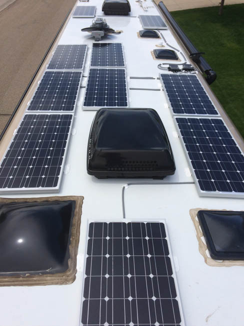 In the case of this Newmar Class A, we installed 1,000 Watts of solar, dual controllers, a battery monitor system, and 900 Amp hours of AGM Batteries. This Class A is ready to camp self contained most anywhere. In the case of this installation the clients didn’t choose to go with Lithium Ion Batteries, and opted for AGMs instead. This is one way you can save a little on your solar installation.